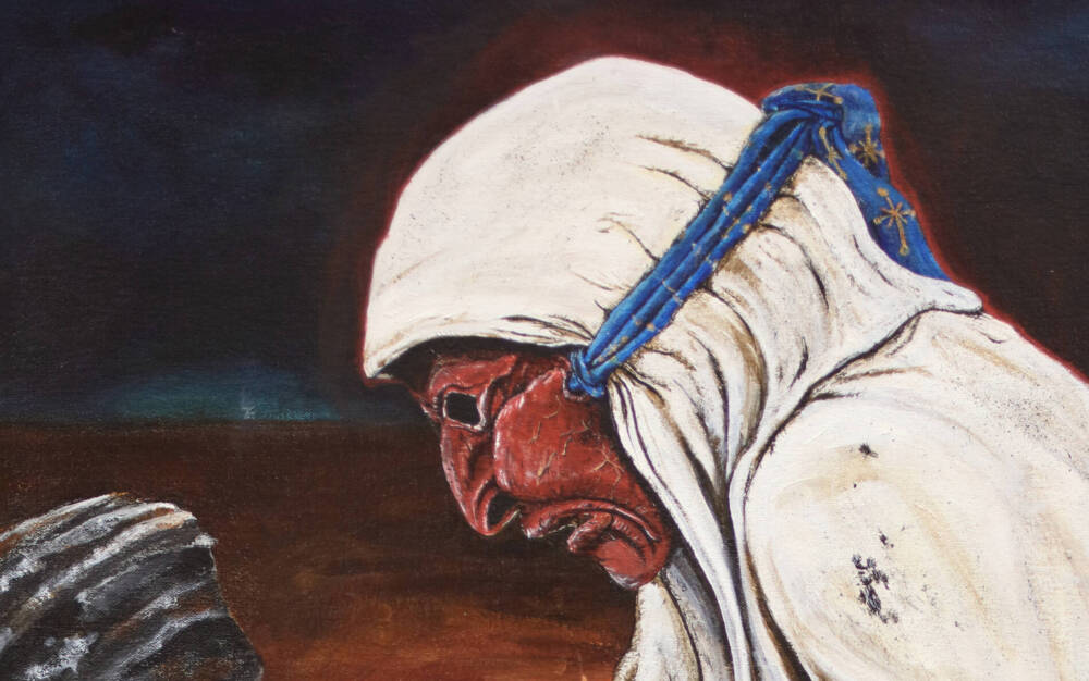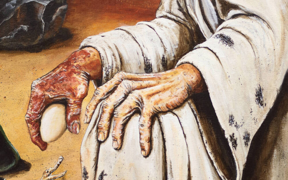 A masked Stranger, bearing the Red Right Hand of Vengeance, approaches a decrepit Oracle who appears to babble into the darkness. The stranger intends to pass by, but the oracle calls out to him by name, commanding him to listen. Upon closer inspection, the stranger recognizes the remnant of cloth on the arm of the mummified ancestor of the Oracle and knows new orders are coming from the Omniscient one. A hummingbird delivers the message. The Stranger offers an egg as token of payment before setting off on this new mission.