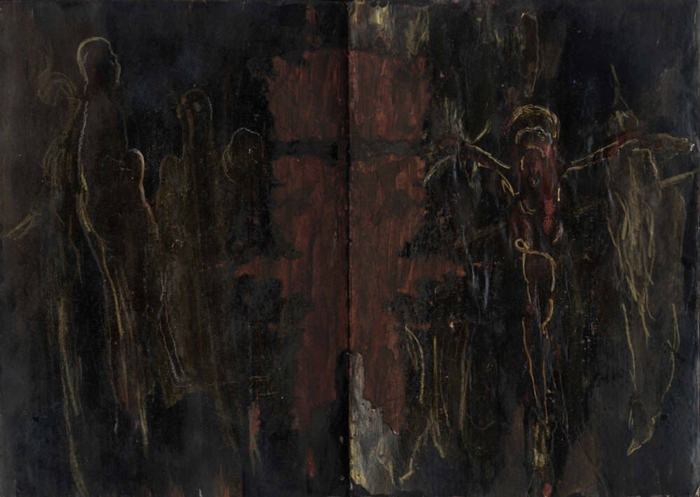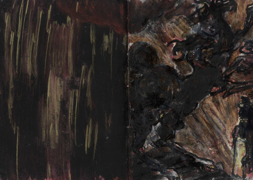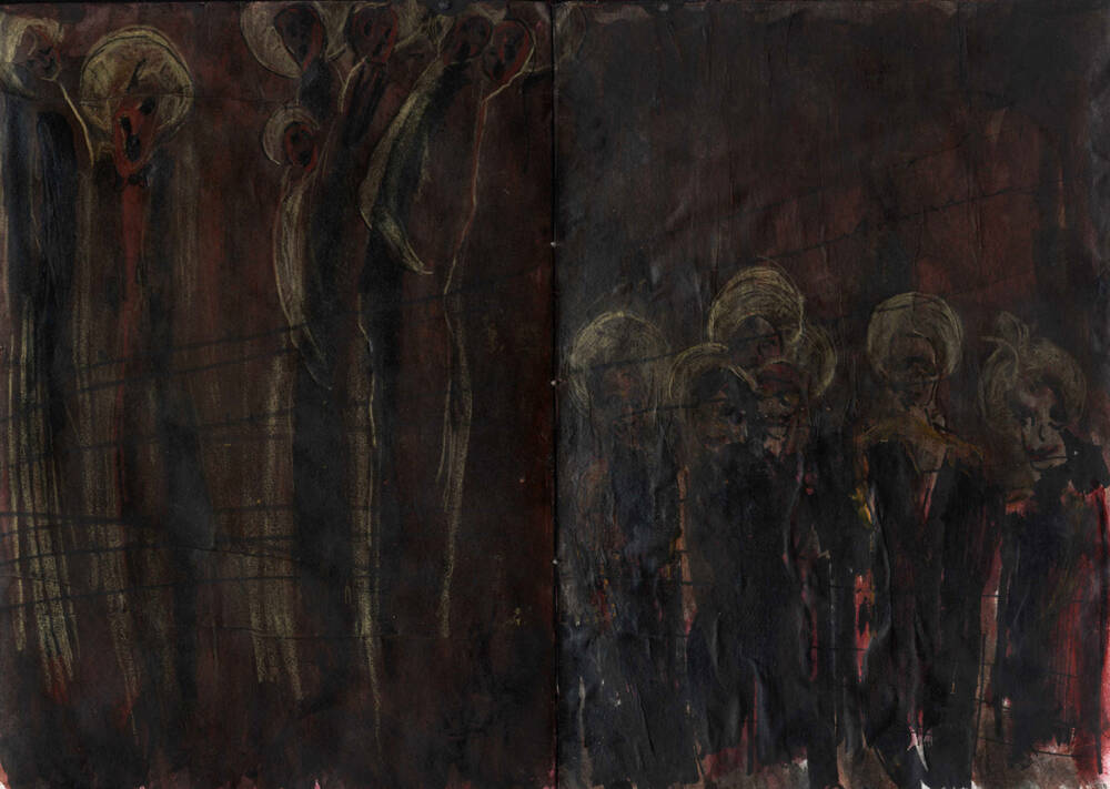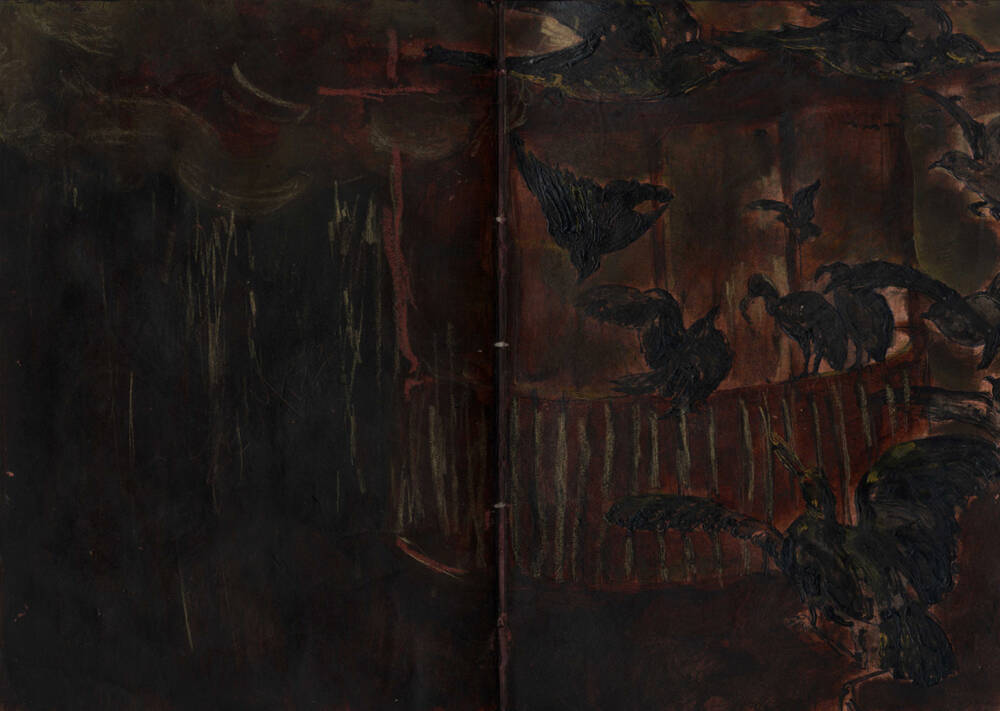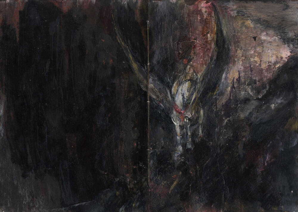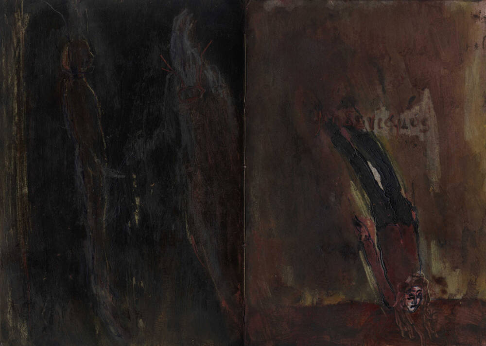 This Art book is handmade, with a leather cover and consists of 23 pages, each containing an artwork. All together they form a dark story. media, oils, acrylics, ink, wax. You can see the rest of the images in Memories Book I.