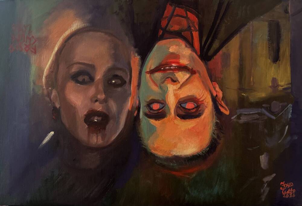 A self-portrait and a portrait of her husband in a dark, Gothic style, depicting vampires. In the background is Heidecksburg Castle in the German city.
