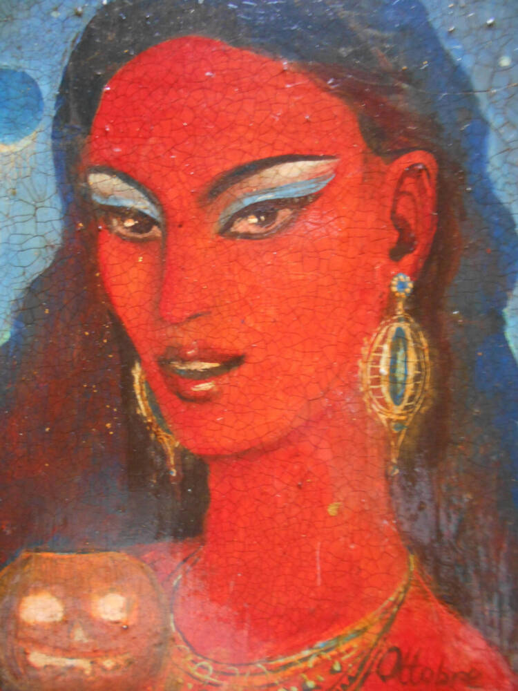 A portreit of a Witch, simbol of October. Made on a wooden desk and covered with a patina varnish.