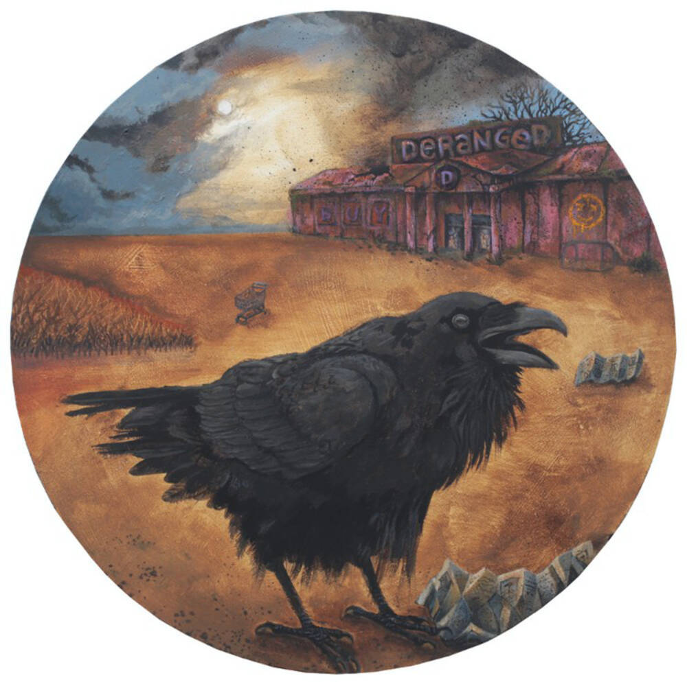 Painting inspired by my former, toxic work environment. I left it in anger- and this artwork was a way to vent it off. I depicted a building that was my cage for a long time as a decaying, abandoned temple of consumerism. The parking lot is a desert, empty and littered, only visited by a raven- it’s beak open in the silent cry.