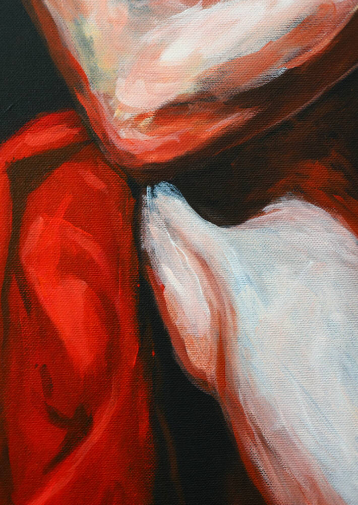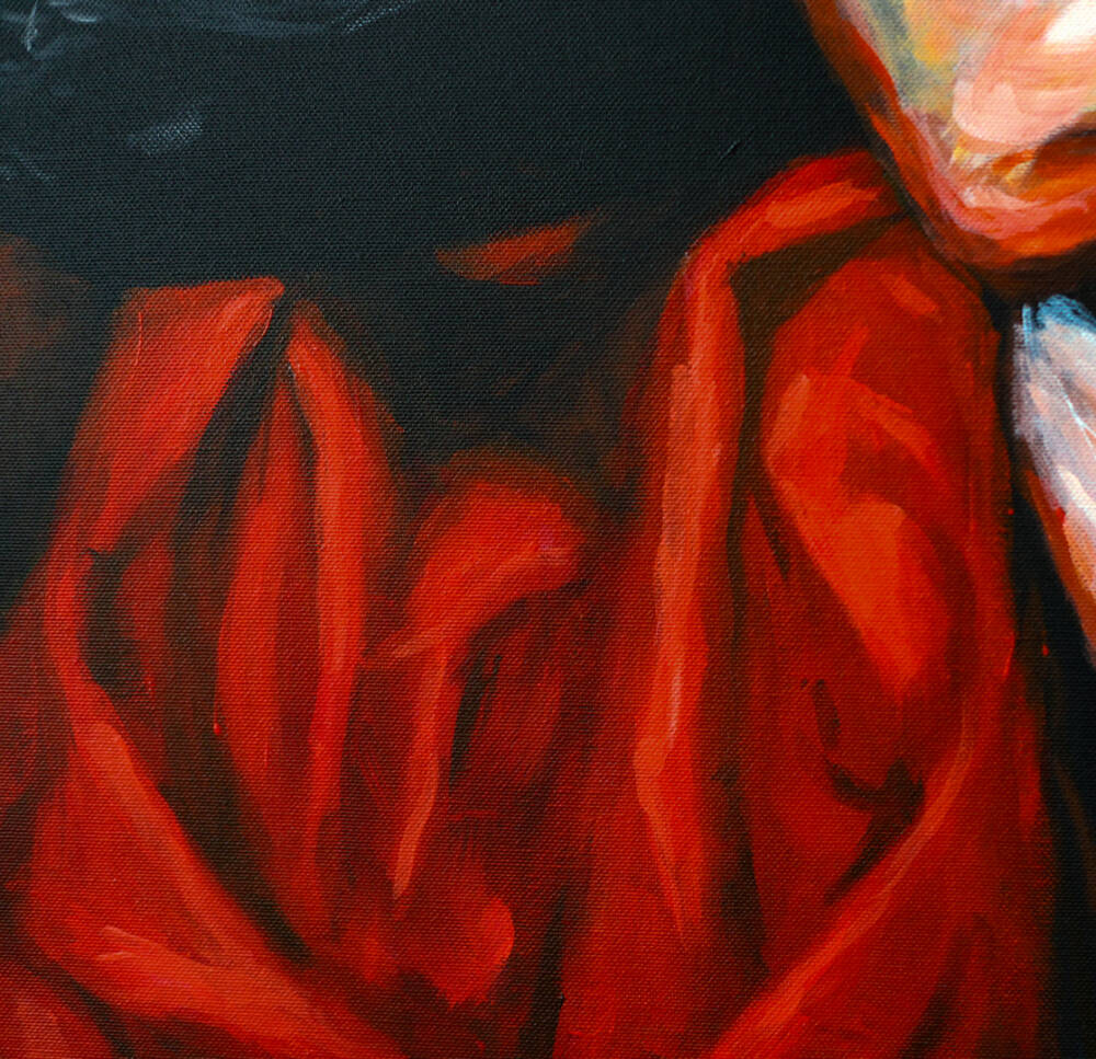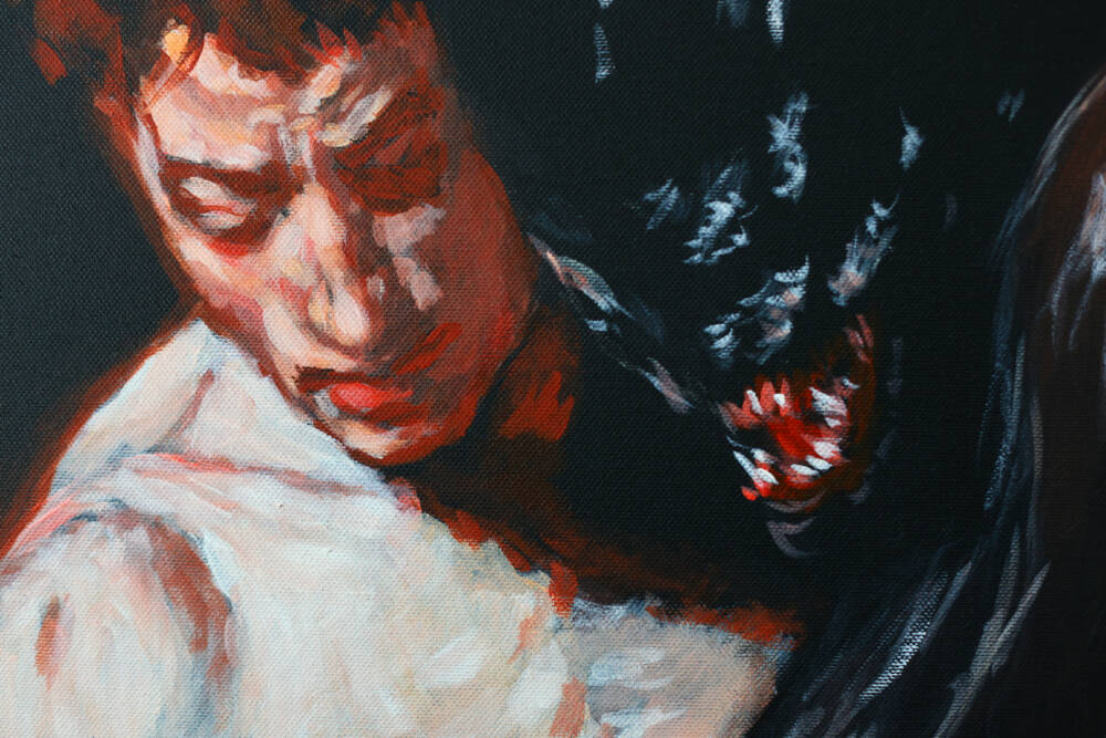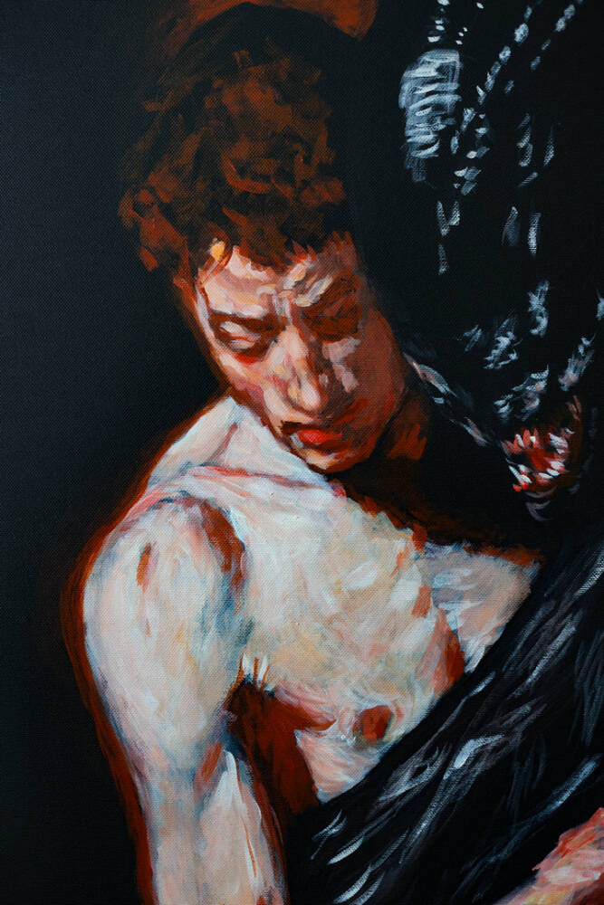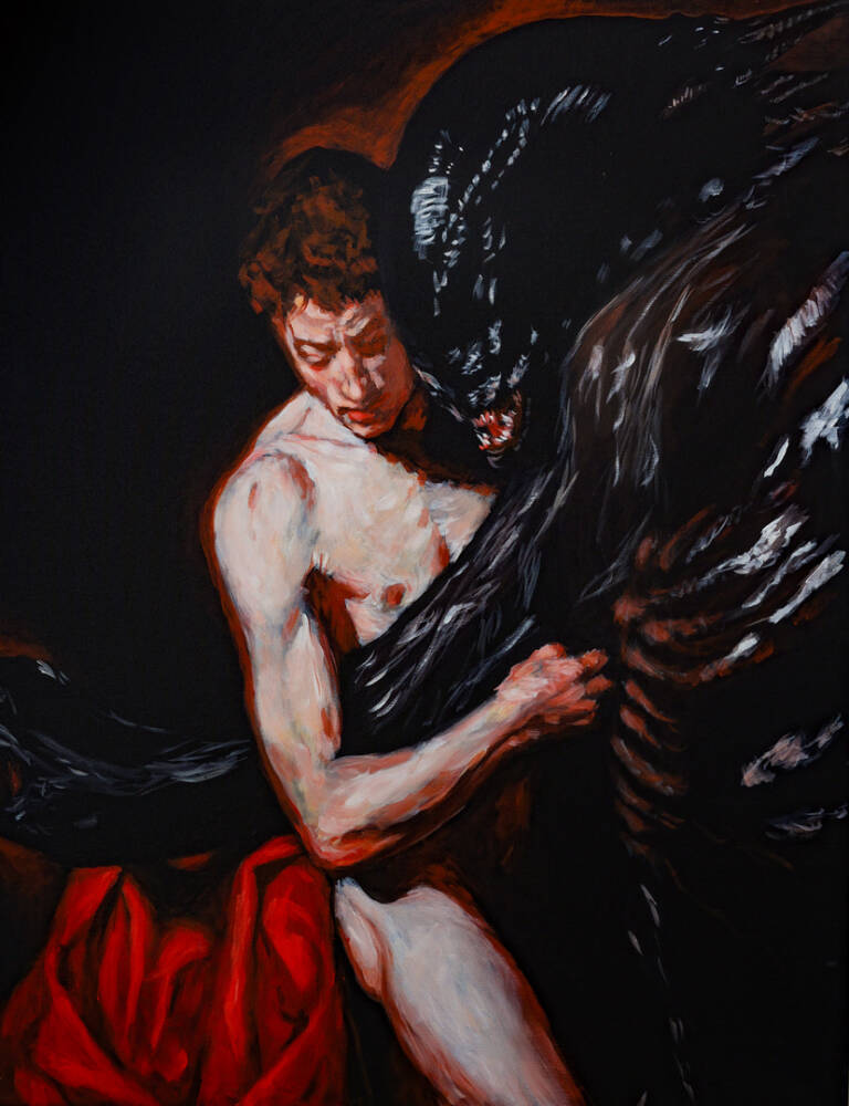 Inspired by the dramatic chiaroscuro and intense psychological realism of Caravaggio, this piece from the In Amplexu Teneo series plunges the viewer into a visceral and ambiguous embrace. A youthful, vulnerable figure, reminiscent of classical sculpture, is locked in a complex interaction with a monstrous, shadowy presence. The rich, velvety blackness that consumes the background is punctuated by a striking accent of cardinal red, a signature motif that evokes passion, danger, and the raw vulnerability of exposed flesh. This red fabric, draped with a painterly confidence, simultaneously conceals and reveals, drawing the eye to the tension between the figures. The ’embrace’ itself is paradoxical; it is an act of both comfort and conflict, of being held and being consumed. The innocent subject appears simultaneously to seek solace and to struggle against the encroaching darkness, their face a mask of pained introspection. The sharp, menacing teeth and gnarled claws of the dark entity suggest a primal, untamed force—perhaps an inner demon, an external threat, or the perilous journey of innocence into experience. The canvas thus becomes a battleground for the soul, a profound meditation on the duality of human nature and the perpetual struggle to hold onto light amidst the shadows.