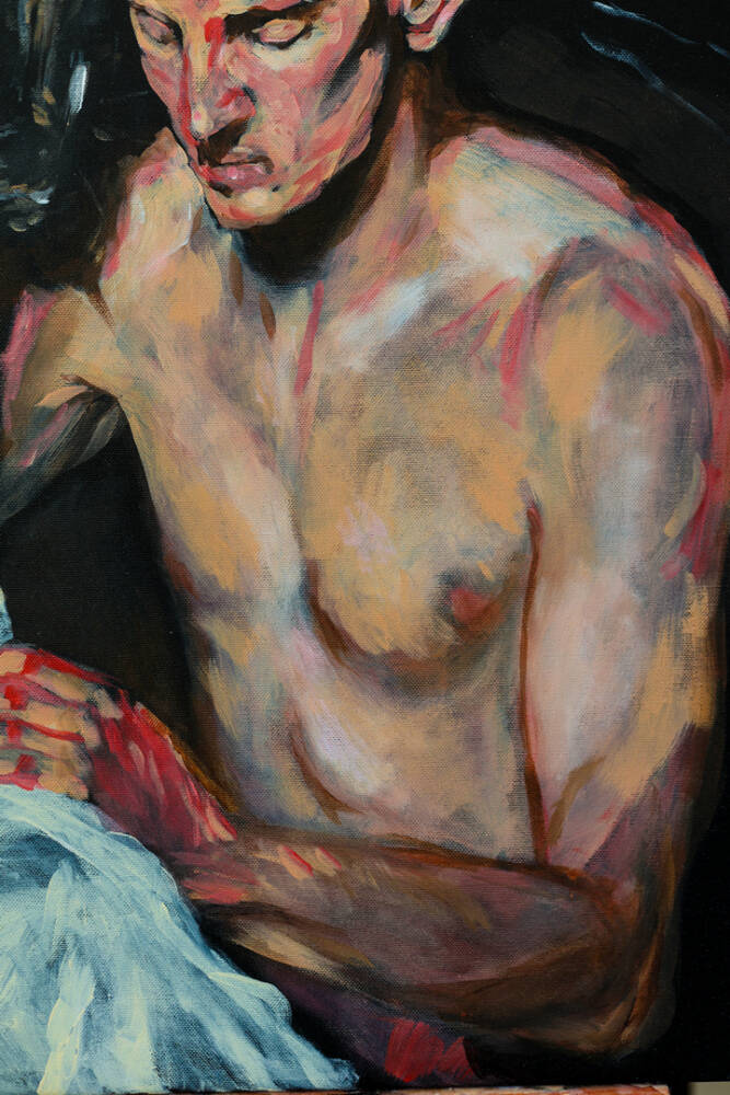 This painting from the series In Amplexu Teneo is a powerful example of figurative art that transcends simple representation to delve into a complex psychological and symbolic space. The acrylic on canvas work is distinguished by its expressive and dynamic brushwork, as well as its masterful use of light and shadow (chiaroscuro). The scene captures two men in an intimate embrace, yet their hunched and tense postures, along with the unsettling red marks on the skin, suggest an experience of pain or inner conflict rather than peace and love. The artist thus creates a visual paradox where the title, referencing an embrace, contrasts sharply with the dramatic and disturbing content of the painting itself.