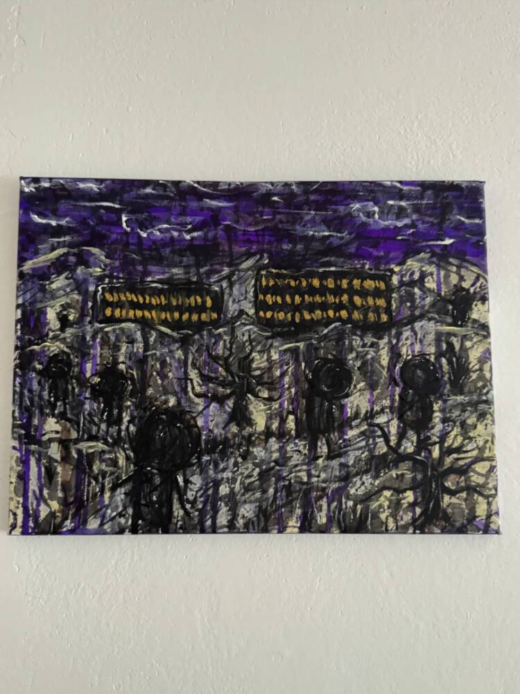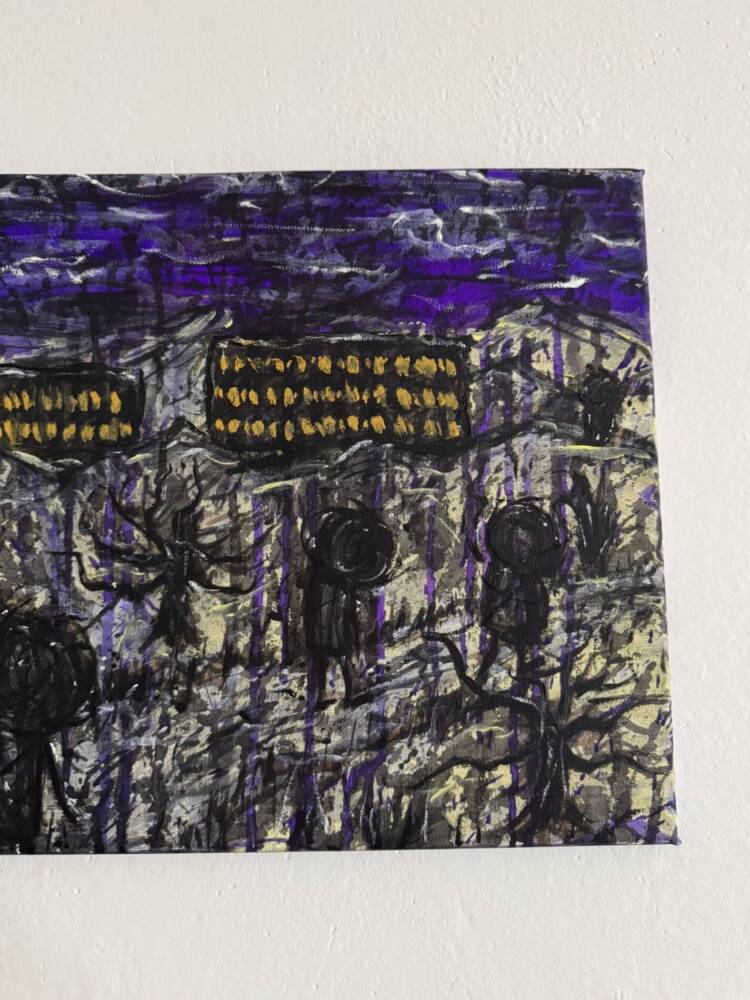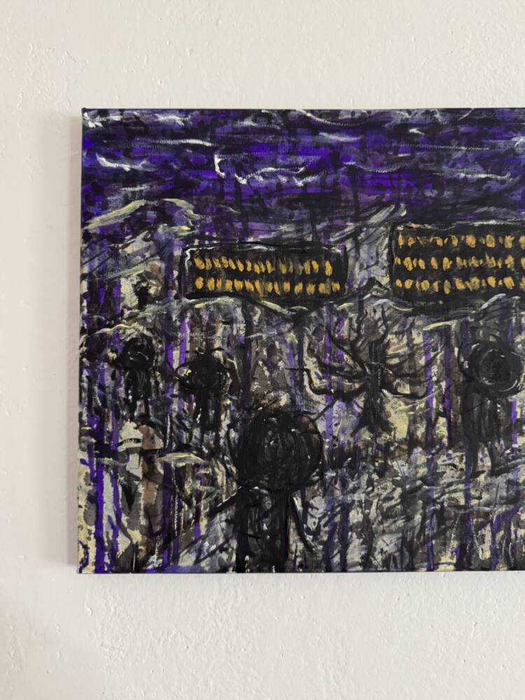 A small but powerful painting that shows a group of faceless, black figures under a stormy purple sky. Quick brushstrokes and bright yellow accents create a dream-like, even nightmarish, atmosphere. The imagery feels both strange and familiar, hinting at collective emotion.