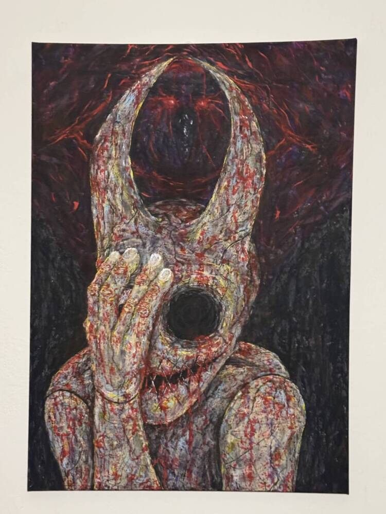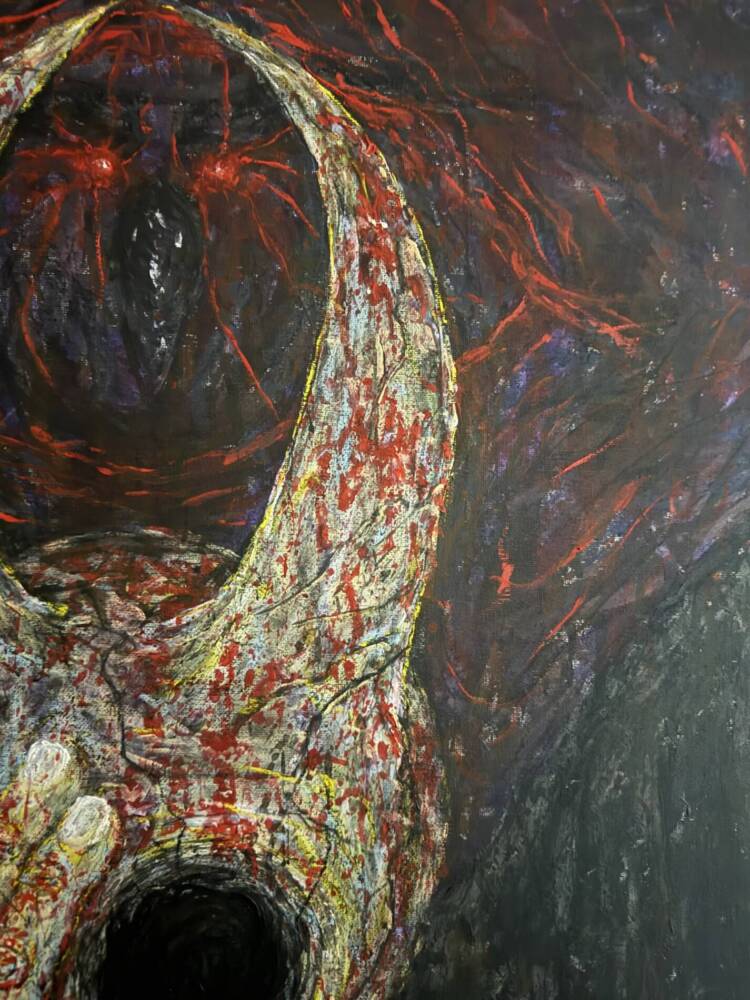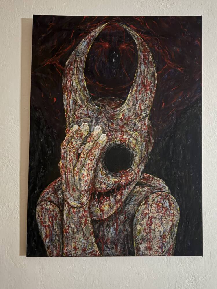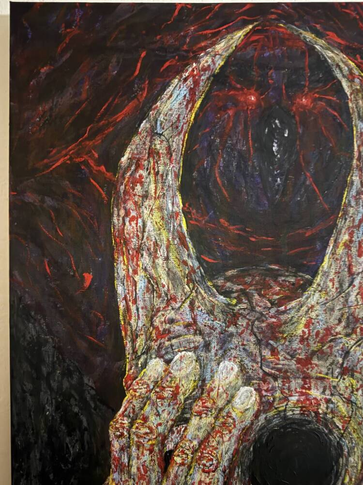 This dramatic figure with a mask-like face and a dark, hollow eye stands out for its haunting quality. The thick textures and splashes of red create a sense of horror, fear, and loss of self. The hand blocking the face makes it even more mysterious.