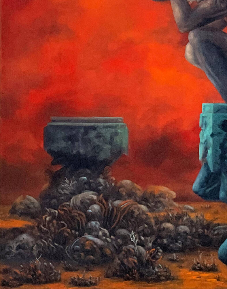 The work is a lamentation for a nation caught between past and present, a visual elegy for promises unfulfilled, for anger unheeded, and for a people too often reduced to rubble in the name of statehood. It speaks to the futility of idealized national identity when its foundation is cracked, and its figures no longer stand but fall under the weight of history.