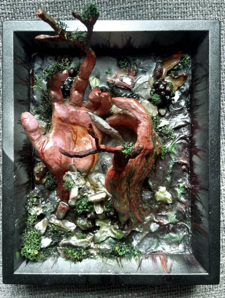 Anatomically detailed hands grow like branches out of a textured, earthy surface. This relief sculpture captures the intersection of human and natural forms. The moss, stones, and tar-like material symbolize decay and rebirth, as if the body is returning to or emerging from the earth. A hybrid of painting, sculpture, and installation, it presents the body as a living artifact of nature’s cycles. The palm holds a small fish as a symbol of attempts to save the last hope