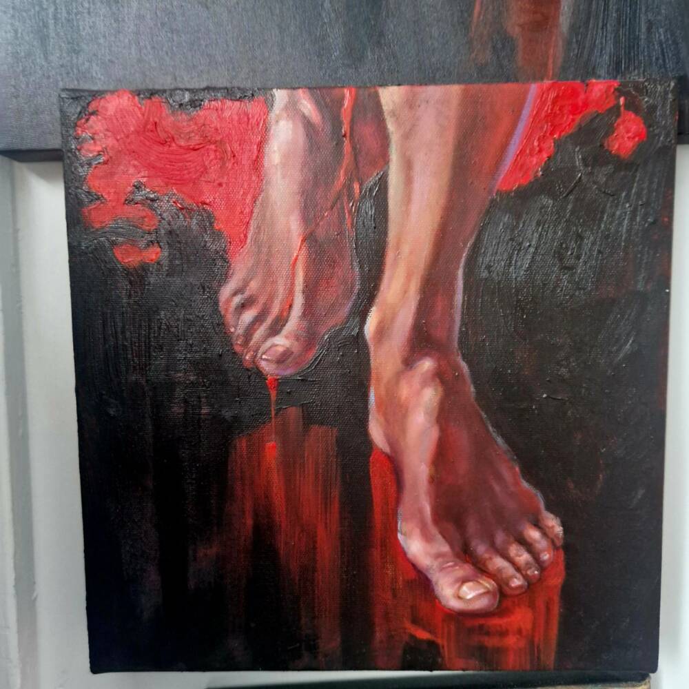 This work features multiple panels forming a fragmented yet cohesive human figure—dark, demonic, and consumed by red fire. Flames and flesh merge, symbolizing rage or transformation.The red spots vaguely resemble the outlines of the Earth’s continents, since the threat is one and common to all. The asymmetric composition emphasizes instability and fragmentation, pointing to a splintered identity. Through a mix of realism and abstraction, the piece explores the boundaries of the self in a burning, aggressive space.
