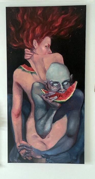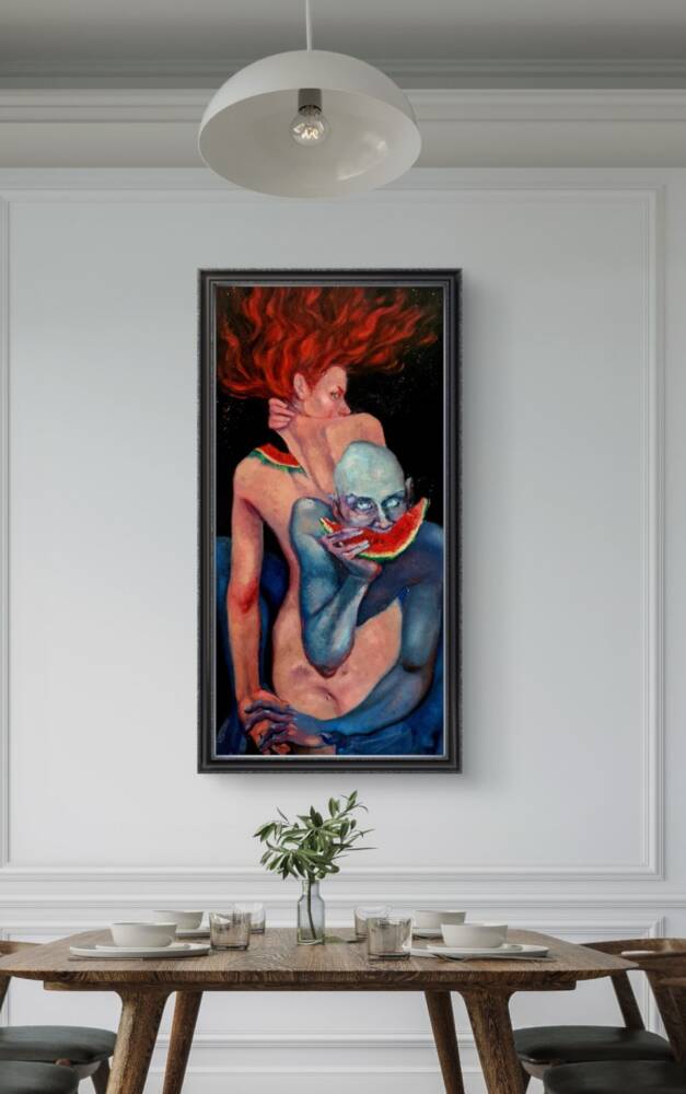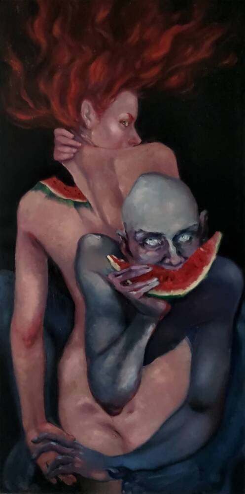 The act of eating the watermelon, traditionally associated with sweetness and vitality, is transformed into an image of appropriation and exploitation. What once was shared nourishment becomes something taken. Yet the composition subtly shifts power: the figure behind is not collapsing under the weight of betrayal, but gathering force. The grip is deliberate. The posture is alert. Strength is being reclaimed.