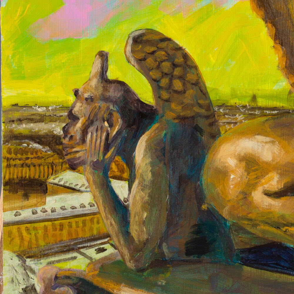 In this piece, I transport the viewer to the vertiginous heights of Notre Dame de Paris. I have reimagined my muse, Lali, as a living gargoyle, a creature carved from ancient stone but pulsing with a hidden, restless heat.