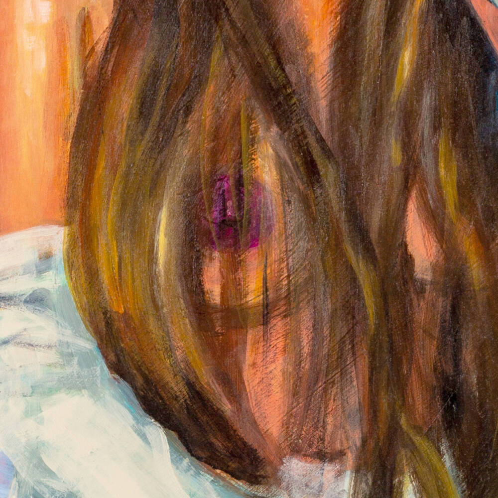 In this piece, I explore the boundary between invitation and danger. I have portrayed my muse, Leina, looking fixedly at the spectator with a gaze that is both a challenge and an offering. She allows her clothing to slide down, revealing her exuberant breasts with a sense of pride and a complete lack of shame.