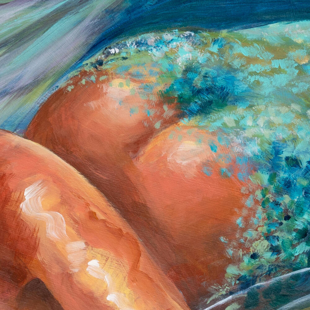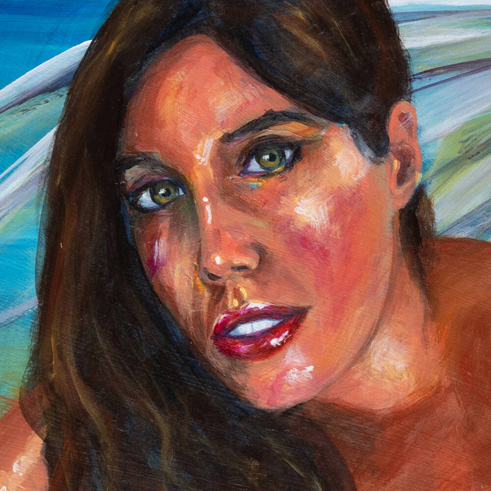 In this painting, I have reimagined my muse Leina as a Nereid, a sea nymph who confronts the viewer with a gaze of absolute defiance and pride in her own nudity.