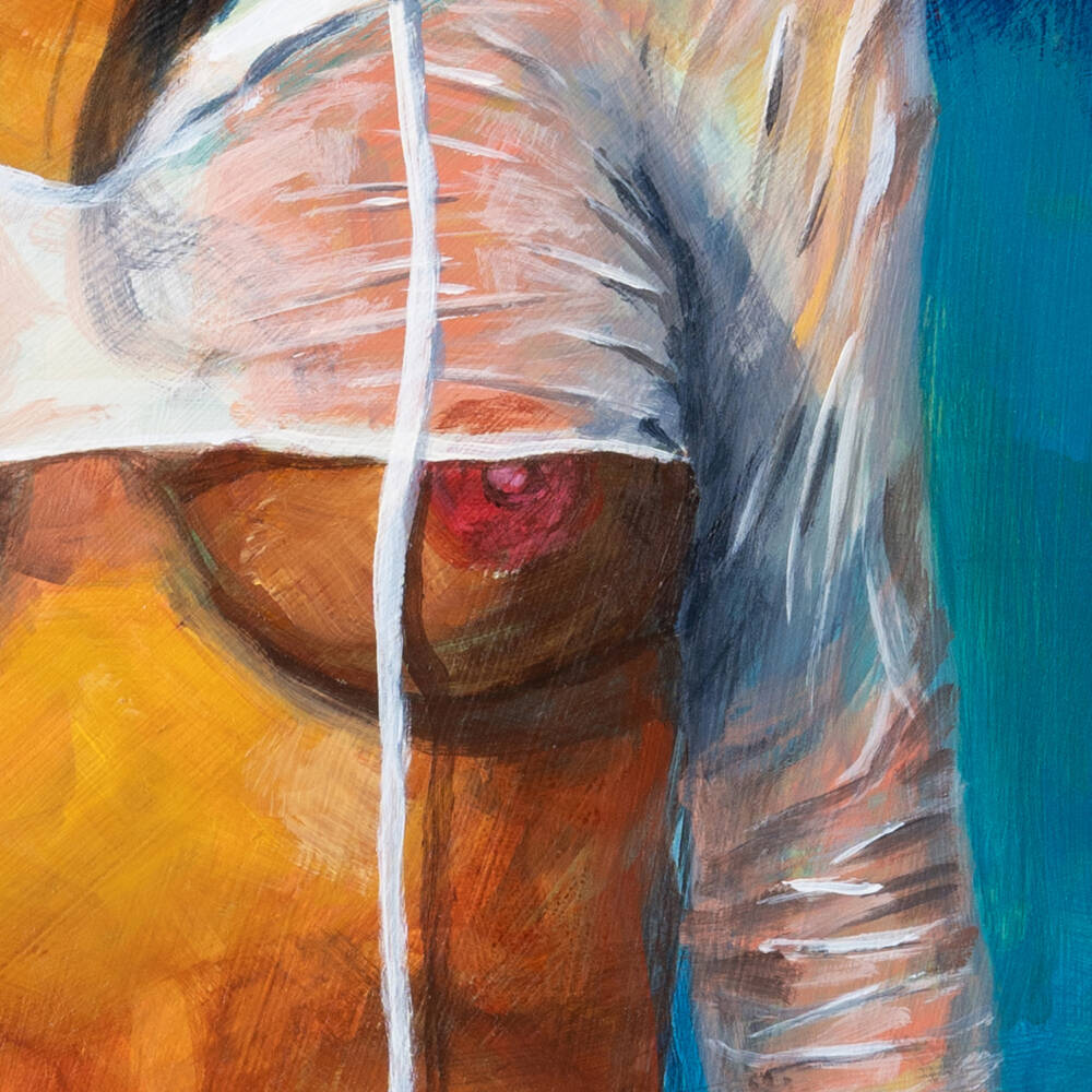 In ‘Nota Mu in the Rain,’ I present a visual shout for freedom. My muse, Nota Mu, wears a strange, succinct garment designed with a single purpose: to amplify her nudity. This piece is a powerful claim of her right to show her nipples and her pubis with absolute pride.