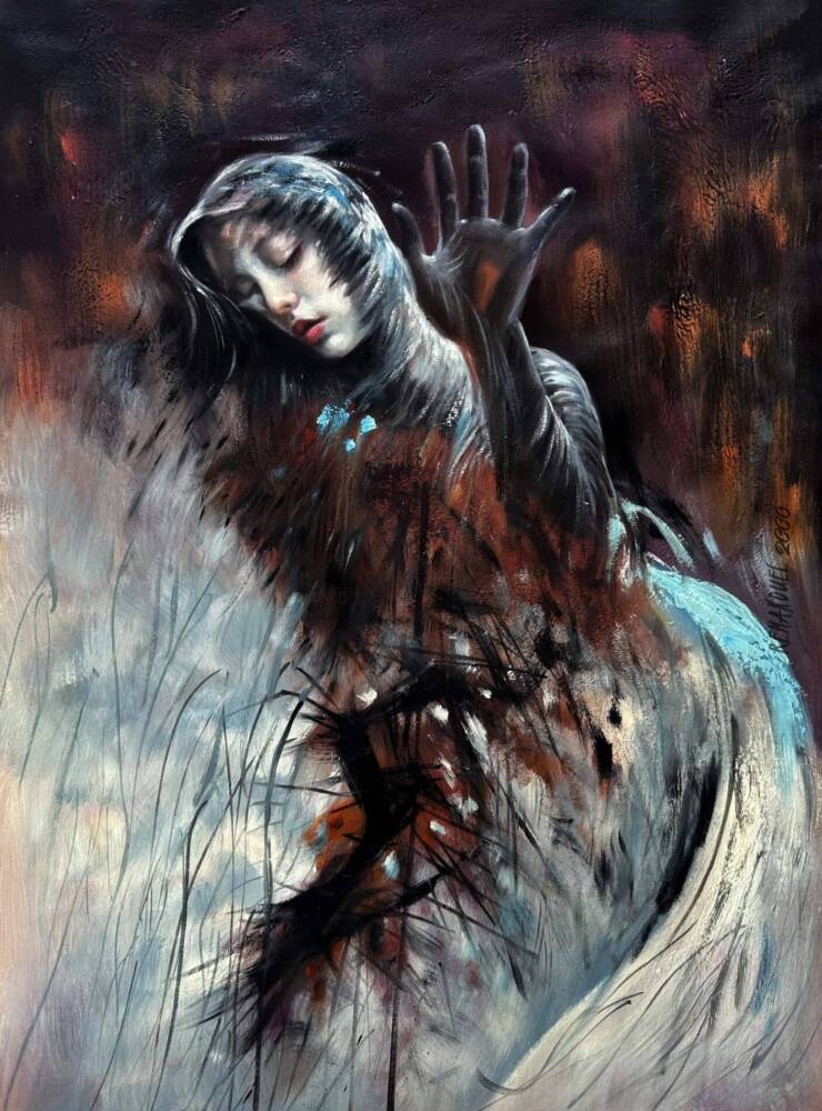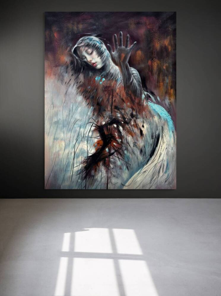 Rendered in a striking palette of deep umbers, icy blues, and raw crimson, the piece pulses with tension and quiet grief. Loose, expressive brushwork and chaotic mark-making contrast the delicate realism of the subject’s face, heightening the emotional impact. Her closed eyes and parted lips suggest surrender or exhaustion — a sense of beauty held in the midst of unraveling.