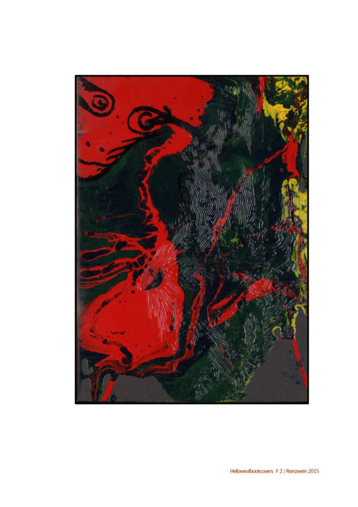 For a Halloween-event in 2014, I made scary objects to decorate the narrative space. One of them were books with screamy messy colors in mind. I spread the book covers upwards and action-painted them with all paints I could find. They iridescent because the paints weren’t compatible. To finalize them I used a marker and draw faces, animals… on it.