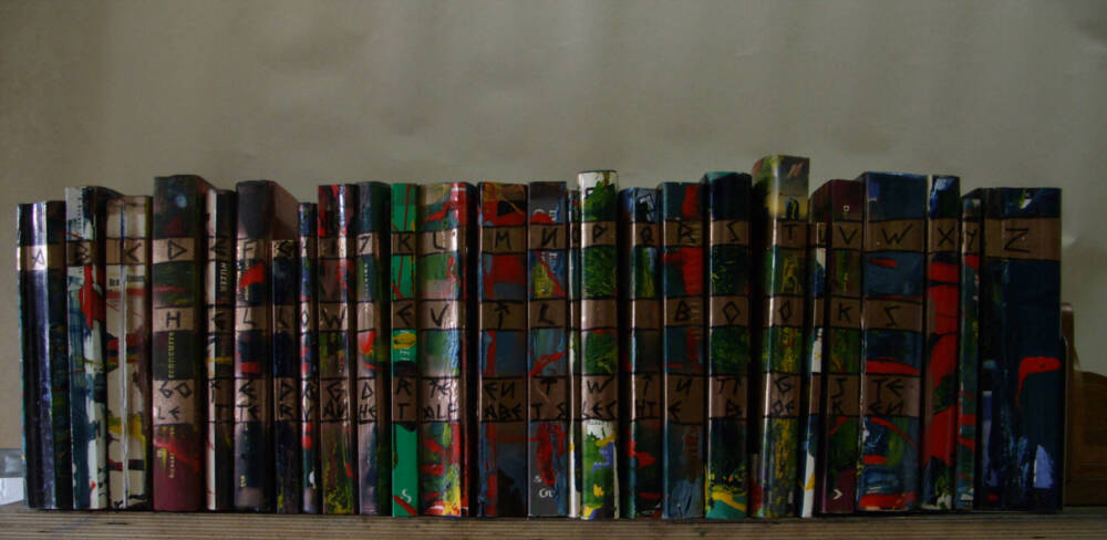 For a Halloween-event in 2014, I made scary objects to decorate the narrative space. One of them were books with screamy messy colors in mind. I spread the book covers upwards and action-painted them with all paints I could find. They iridescent because the paints weren’t compatible. To finalize them I used a marker and draw faces, animals… on it.