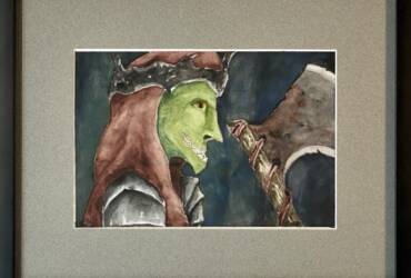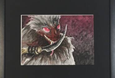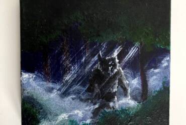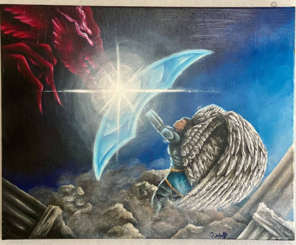 Original acrylic painting an angel battling a demon. A great battle has been fought and all around there is the rubble of the once beautiful city of Thesity. The last few soldiers battling scattered across the city. One such pair we see fighting as a angel soldier shields against a demon’s attack as it strikes out. Painted on 20″ by 16″ inches stretched canvas. Finished with a clear varnish for protection.