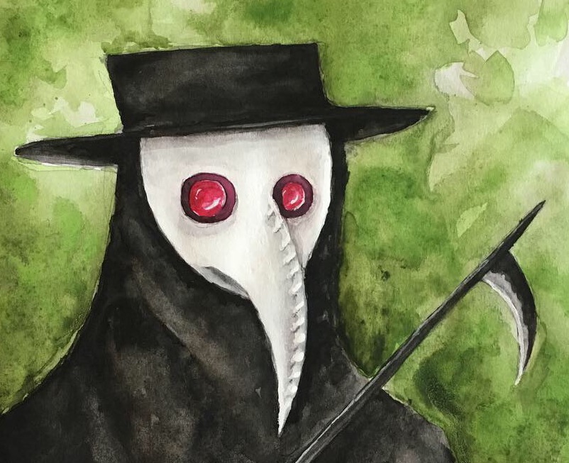 With a cloud of green gas covering the background. With red eyes shining from the plague mask.