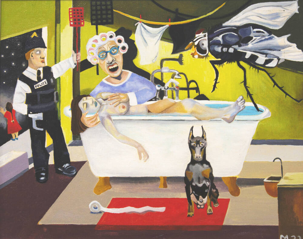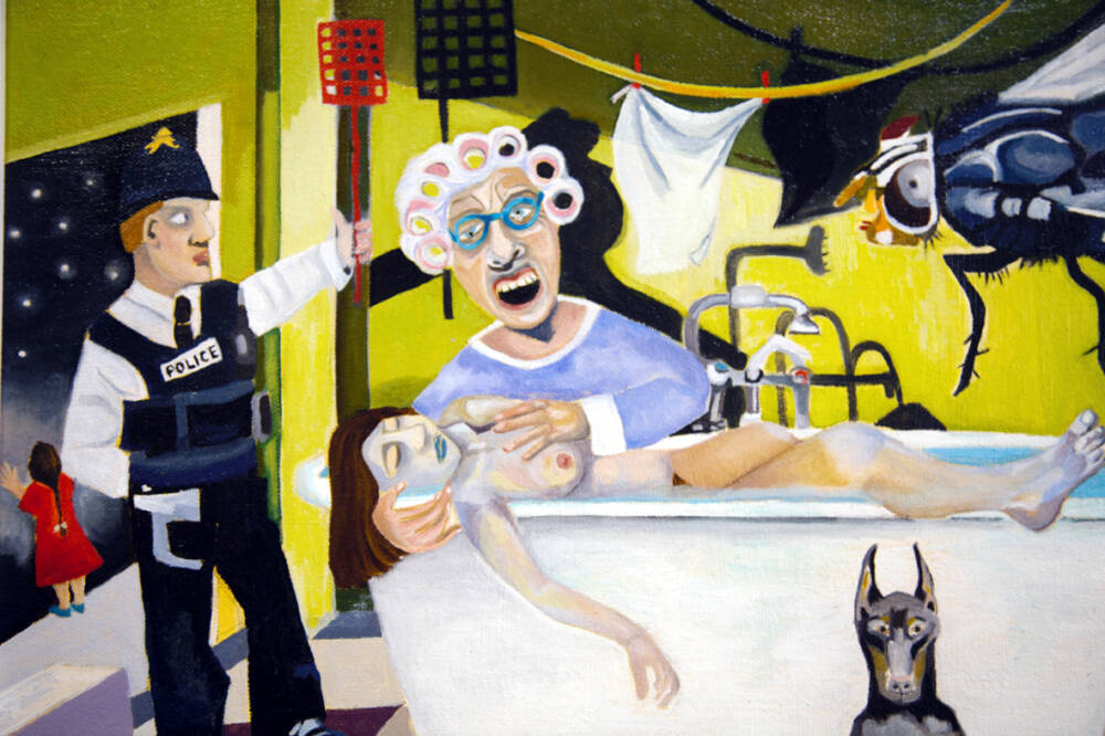 A vivid, unsettling scene unfolds in a domestic interior: a woman screams, a policeman stands holding a fly swatter, and a giant fly enters the frame. A bewildered dog gazes at the viewer, while a distant figure reaches toward the stars. Blending absurdity and sorrow, the painting captures the surreal stillness of a moment fractured by grief.