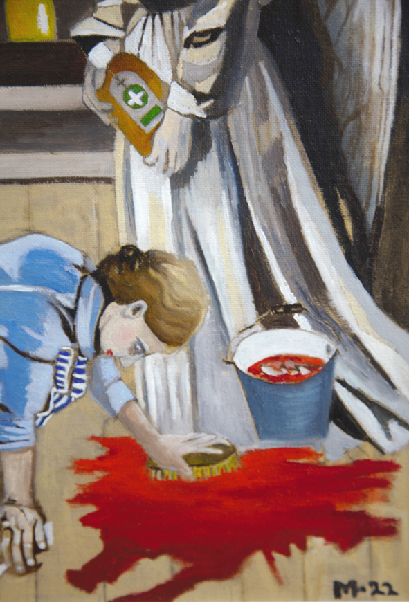 This painting doesn’t just carry emotion — it invites interrogation. A woman scrubs a pool of blood from the floor in silence, her face to the ground. Her body speaks of exhaustion, resignation. Behind her, an angel offers a bottle of disinfectant — an act of sympathy, but also helplessness.