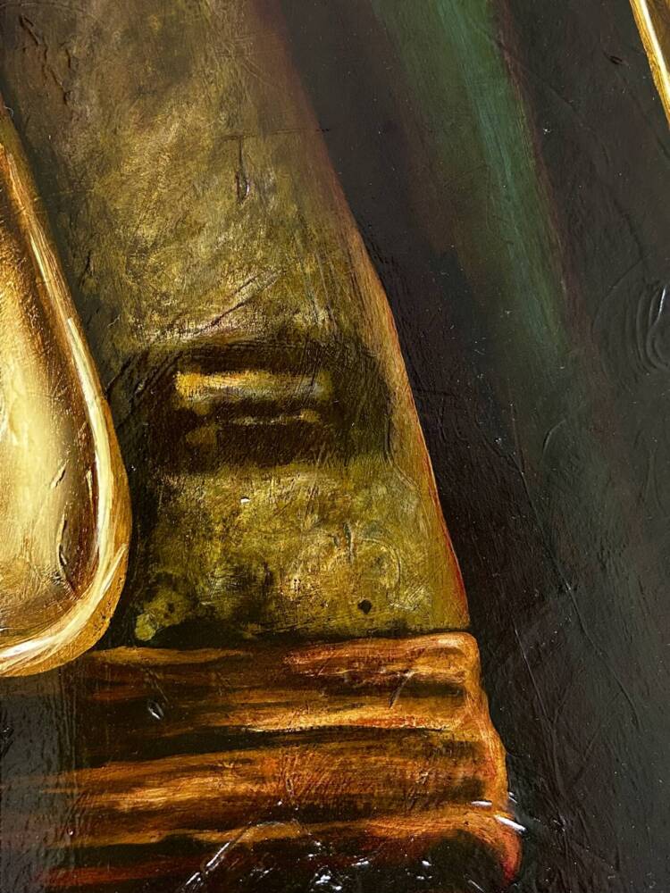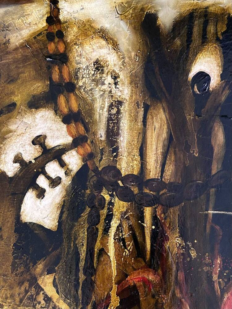 It’s a view through a car window from sitting behind the driver. I liked the idea that the viewer of the painting is the passenger. In a sense an interactive piece. I was influenced largely by Joseph Conrad’s novella ‘Heart of Darkness’ & although the painting is not centred around a journey on a boat, I was drawn to the idea of a journey into the unknown.