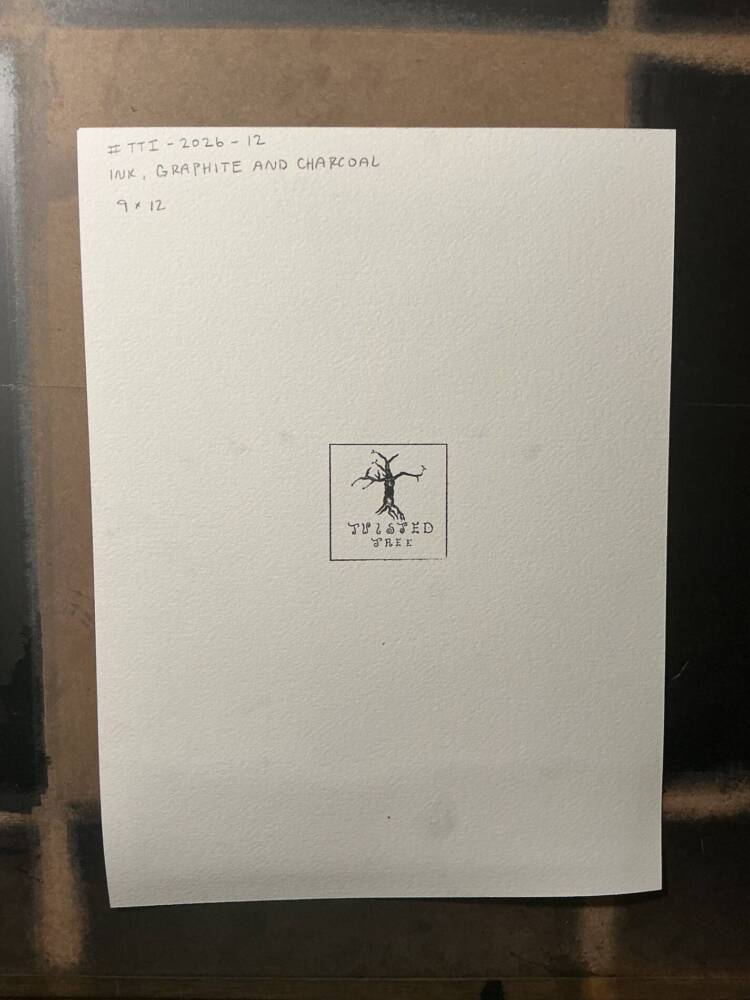 Ink, graphite and charcoal on 100% cotton paper. 9×12, please note, this piece is slightly larger than 9×12 and will not fit in a traditional 9×12 frame. Consider matting to fit an 11×14 frame, or talk to your local framer for options.