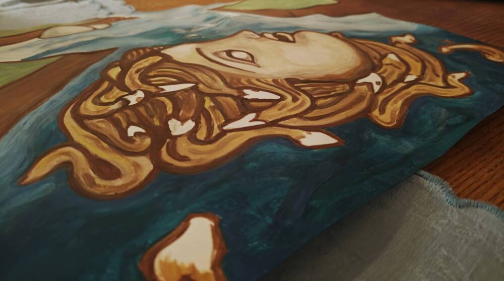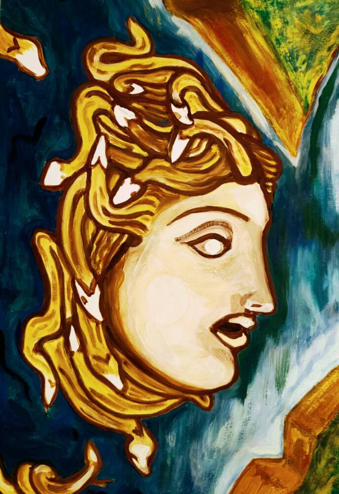 The painting represents the face of Medusa emerging from the waters. The myth is represented in the role of the melancholic Ophelia, a character from Shakespeare’s tragedy Hamlet. Driven by despair at Hamlet’s refusal, she lets herself drown in the waters of a pond. The artwork is part of the new “Facescapes” collection. Facescapes are studies about symbol, myth and archetype through nature’s morphology as expressions of biophilia. These faces emerge from the landscape like islands and merge with it through tectonic forms and the landscape’s morphology. The figures represented fall somewhere between physics and metaphysics, according to Aristotle’s philosophy which they are divided into representation of nature (physics) and its cognitive investigation (meta-physics).